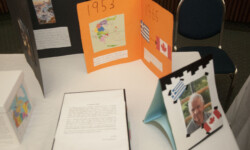 Εντυπωσιακά ήταν και τα αντικείμενα που συγκέντρωσαν οι μαθητές για την ταυτόχρονη έκθεση, στην αίθουσα δεξιώσεων του Κοινοτικού Κέντρου: Διαβατήρια, δελτία ταυτότητας, βαλίτσες, εικόνες, κάρτες επιβίβασης, κούκλες και λεπτομερή σενάρια ταξιδιών από όλη την Ελλάδα στο Χάλιφαξ και στη συνέχεια στο Μοντρεάλ. Στοιχεία που αποδεικνύουν τον αγώνα των παππούδων και των γιαγιάδων μας, να δημιουργήσουν μια καλύτερη ζωή για τους ίδιους, αλλά και για τα παιδιά τους. Τη διαπίστωση αυτή υπογράμμισε στην ομιλία του και ο Πρόεδρος της ΕΚΜΜ, Νικόλαος Τ. Παγώνης, ο οποίος εξέφρασε τον θαυμασμό του και συνεχάρη τους μαθητές για την εμπνευσμένη παρουσίασή τους.