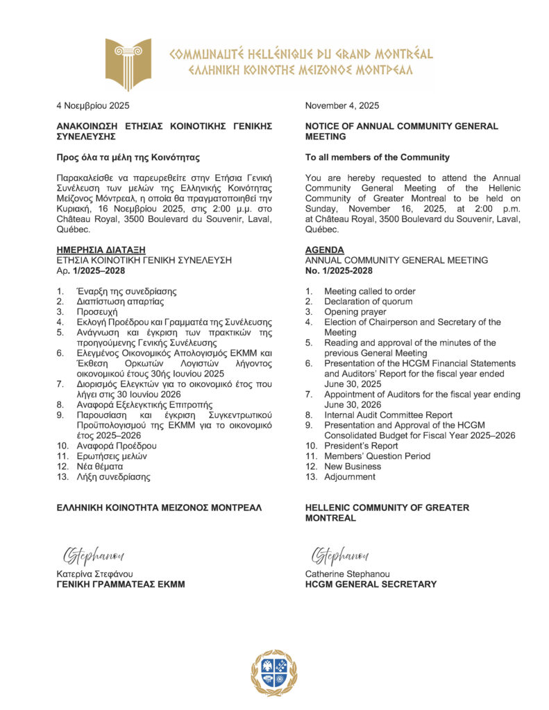 You are hereby requested to attend the Annual Community General Meeting of the Hellenic Community of Greater Montreal to be held on Sunday, November 16, 2025, at 2:00 p.m. at Château Royal, 3500 Boulevard du Souvenir, Laval, Québec.
