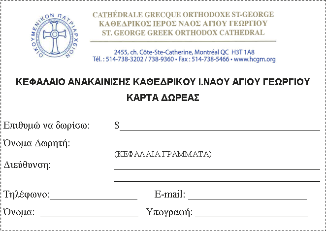 Καμιά προσφορά δεν είναι μικρή, σας καλούμε να κάνετε την δωρεά σας με σκοπό την διατήρηση του Καθεδρικού Ιερού Ναού Αγίου Γεωργίου ως κληρονομιά προς τις επόμενες γενεές. Η προσφορά σας να είναι πληρωτέα στο St. George’s Cathedral. Για κάθε ποσό που θα προσφέρετε θα σας δοθεί απόδειξη δωρεάς, για φορολογική χρήση.